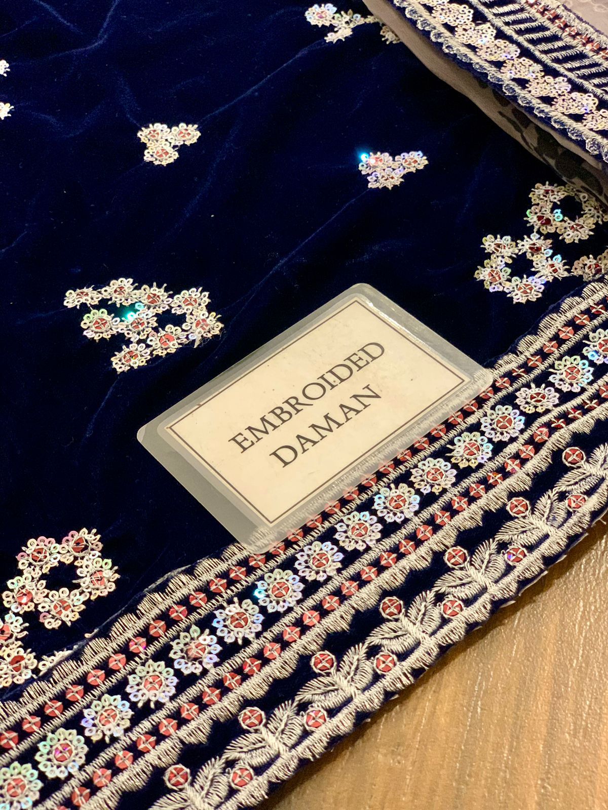 velvet plain back with velvet heavy embroidered spengle work back daman boarder with embroidered spengle work chak lace